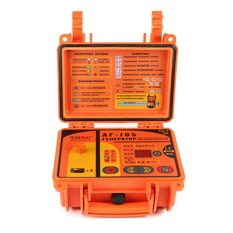 Генератор трассировочный импульсный автоматический АГ-105 предназначен для создания распространяющихся сигналов (колебаний) в трассах скрытых коммуникаций при активном методе трассопоиска. Прибор создает в исследуемой коммуникации переменный синусоидальный ток (постоянно или кратковременными посылками) необходимый для определения ее местоположения.